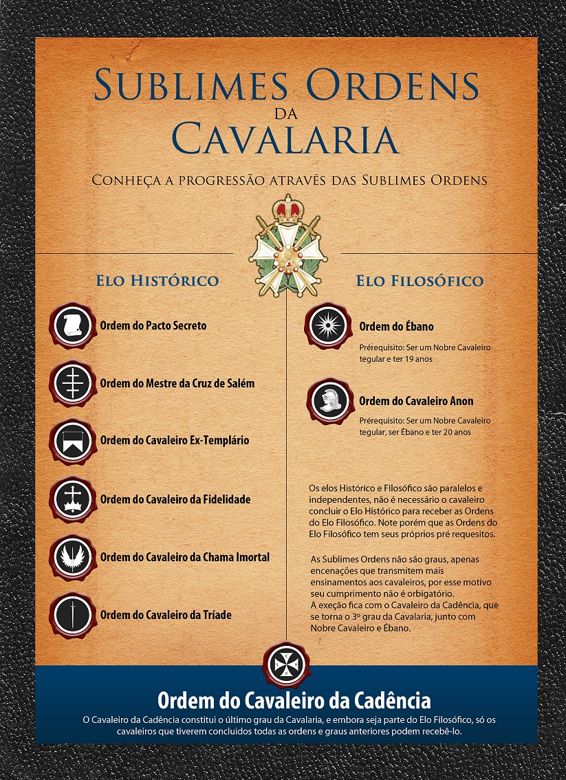 As Sublimes Ordens de Cavalaria são uma série de encenações de cunho histórico-filosófico que visam proporcionar aos Cavaleiros um maior conhecimento da história acerca da Ordem dos Cavaleiros Templários e da vida de nosso patrono, Jacques DeMolay. Estas Ordens foram distribuídas em dois Elos principais, de acordo com seu caráter: Elo Histórico e Elo Filosófico, conforme o infográfico abaixo.